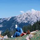 盛夏夕陽湖邊碼頭燈塔上吃西瓜的少女