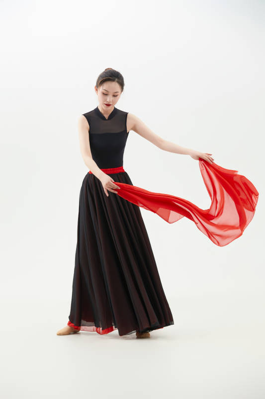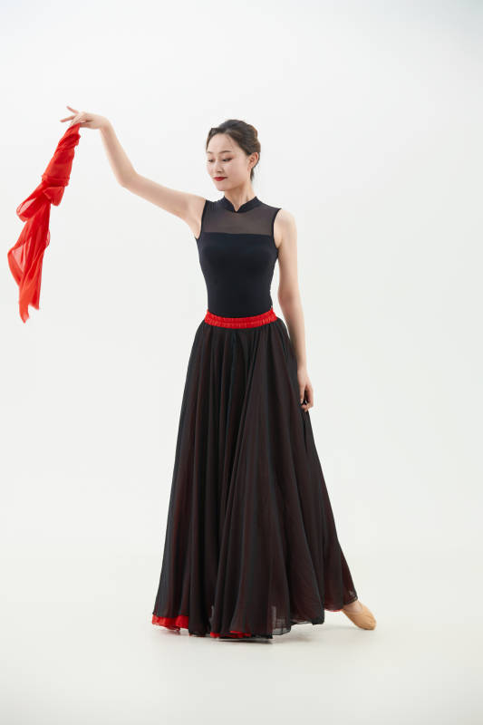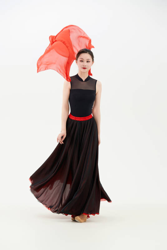 身穿紅黑相間的舞蹈長裙翩翩起舞的少女