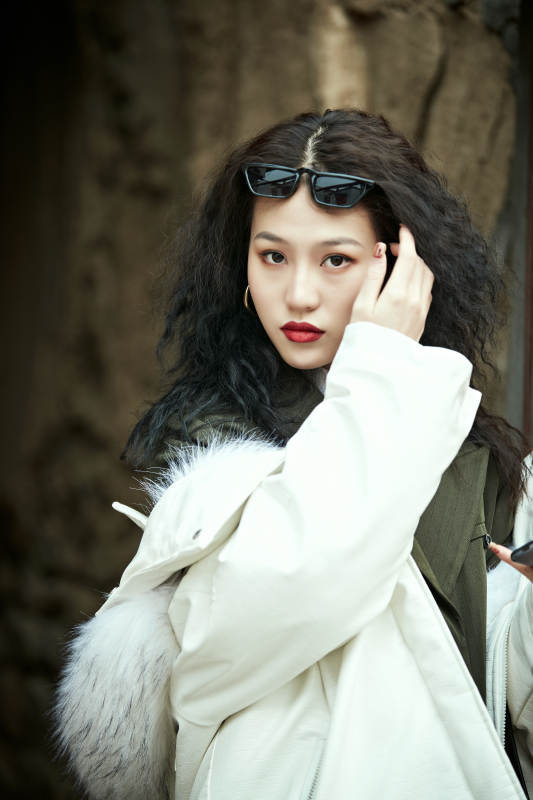 冬季穿搭 白色羽絨服 紅色毛衣 黑色貝雷帽 女性時尚 室外拍攝 傳統(tǒng)建筑背景 暖色調(diào)服飾 冬季保暖 時尚造型