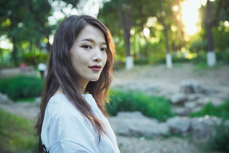 戶外公園夕陽下逆光拍攝的亞洲美少女