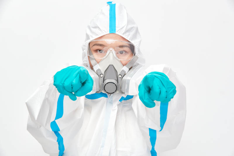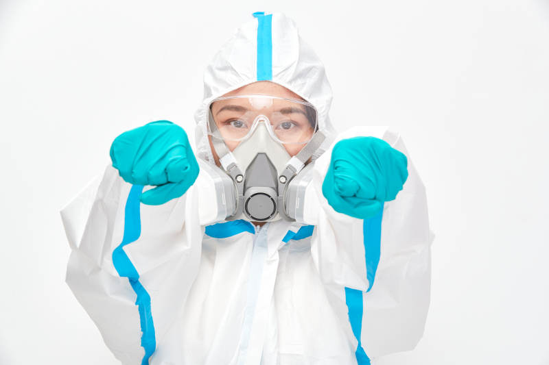 穿白色防護服佩戴護目鏡口罩的女性防護人員