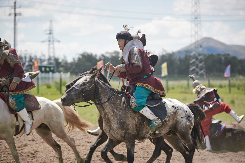 在草原景區(qū)表演的蒙古古代騎馬打仗演出