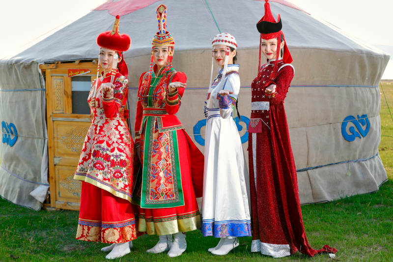 草原上蒙古包前穿蒙古族傳統服飾的年輕夫妻