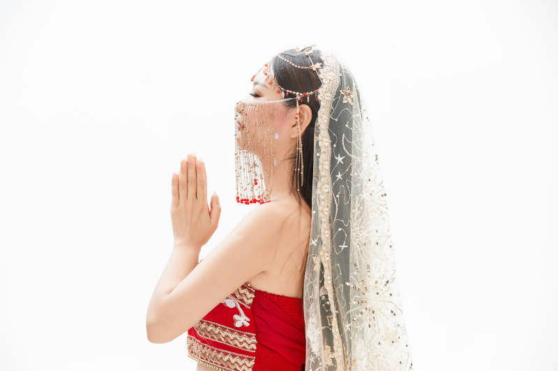 民間故事白蛇傳中小青服飾妝面的亞洲少女