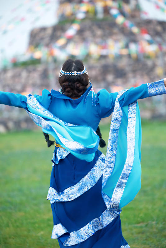 身著唐代宮廷簪花仕女服手持輕扇的女性
