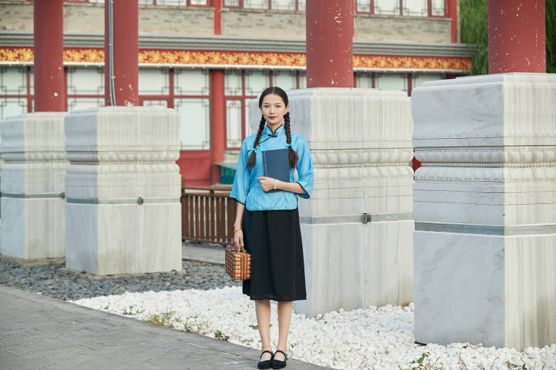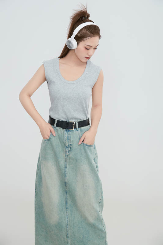 牛仔長裙 灰色背心 黑色腰帶 白色運(yùn)動(dòng)鞋 高馬尾 白色耳機(jī) 時(shí)尚穿搭 簡約風(fēng)格 女性模特 淺藍(lán)色牛仔布