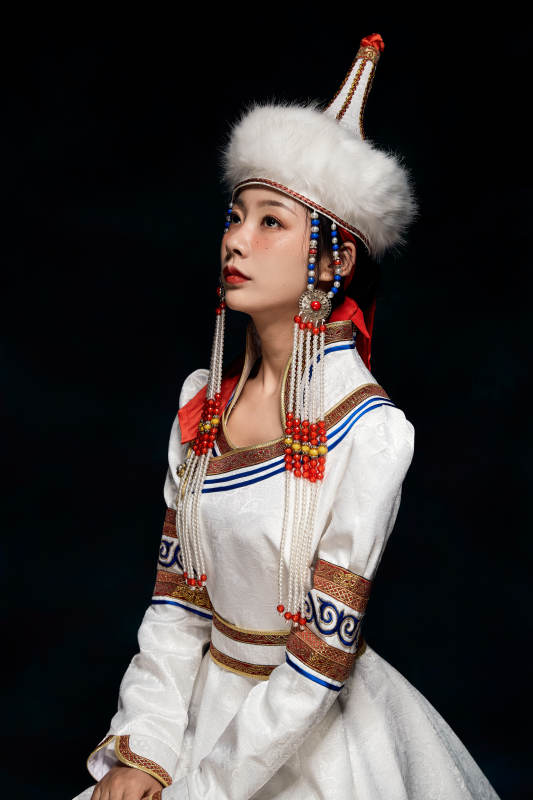 草原上身穿豪華蒙古族服飾的蒙族少女