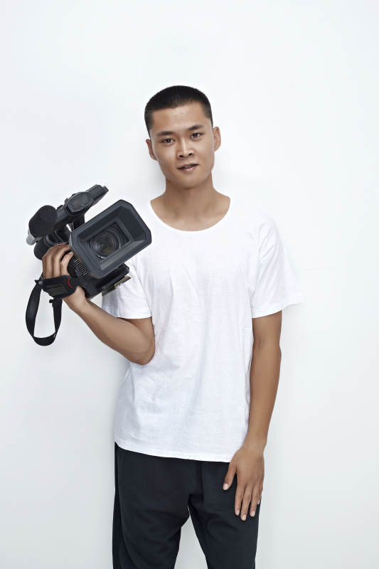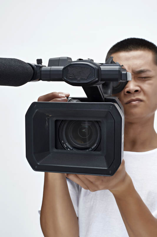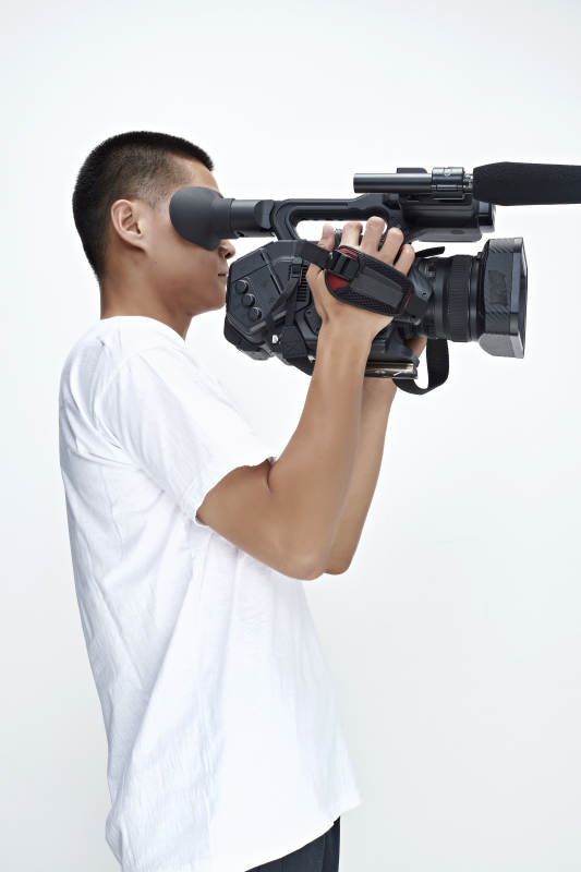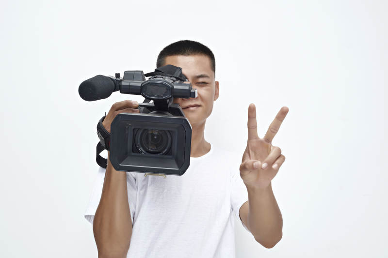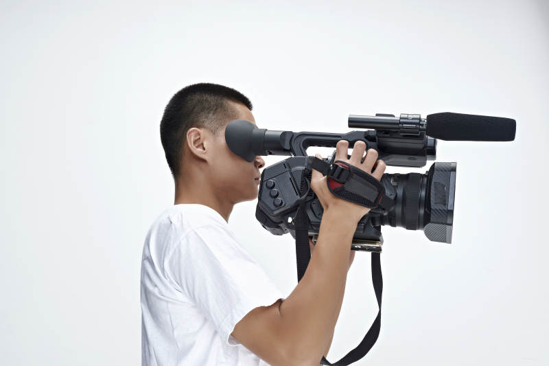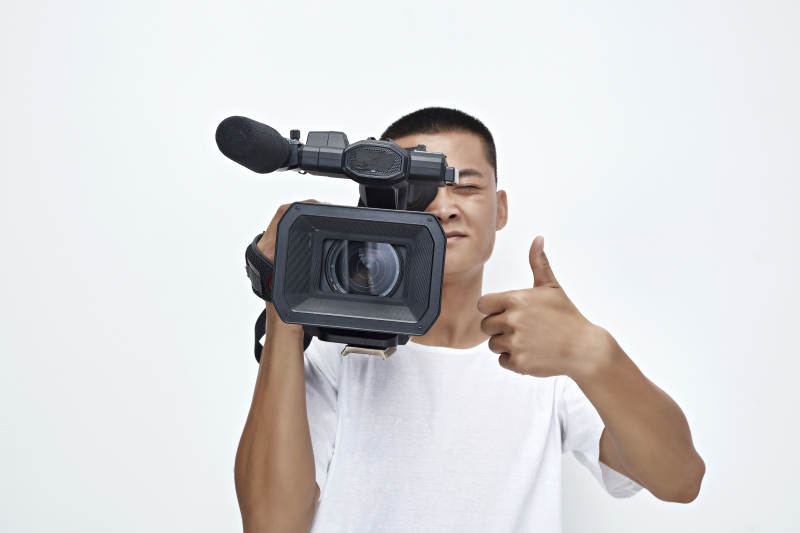白色背景下手持攝像機進行錄制拍攝的攝像師