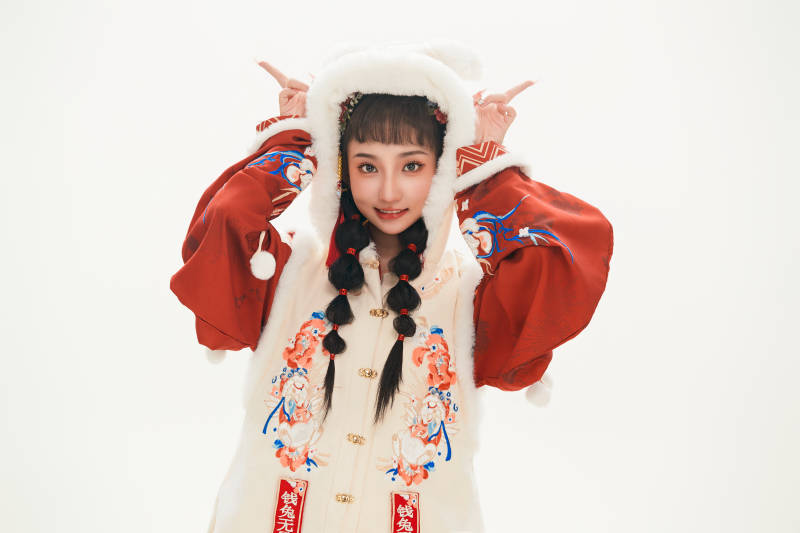 白色背景下穿著中國(guó)清朝宮廷服飾的少女