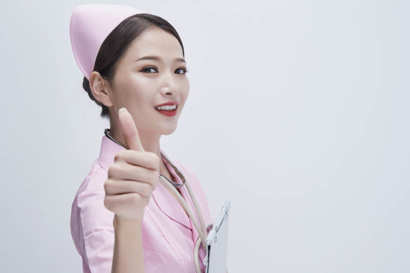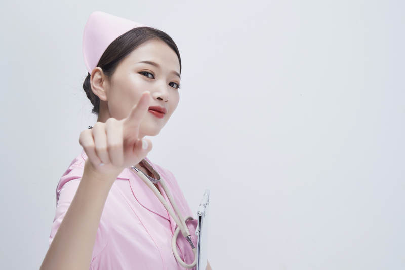 穿粉色護士服戴聽診器手持病歷夾的醫護人員