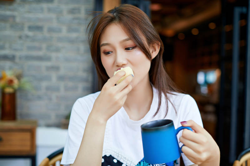 冬季夜晚在咖啡店品嘗咖啡的東方美女