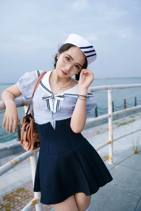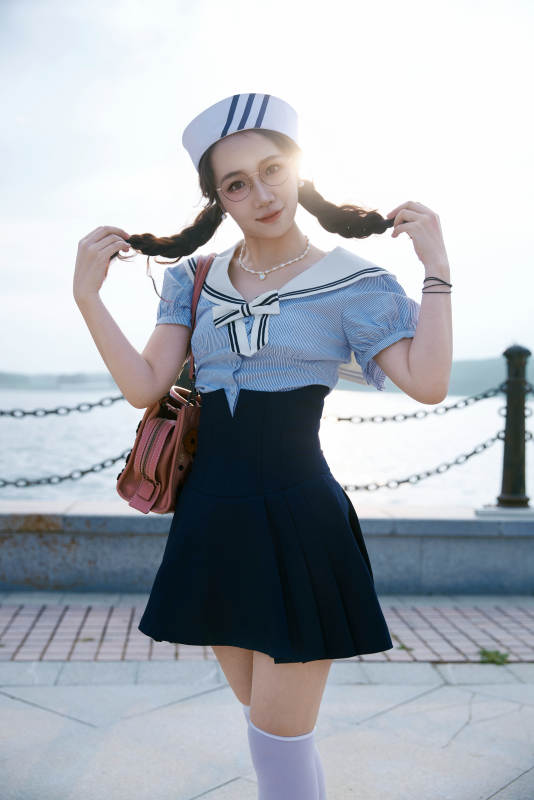 身穿水兵服在湖畔打卡拍照的亞洲美女