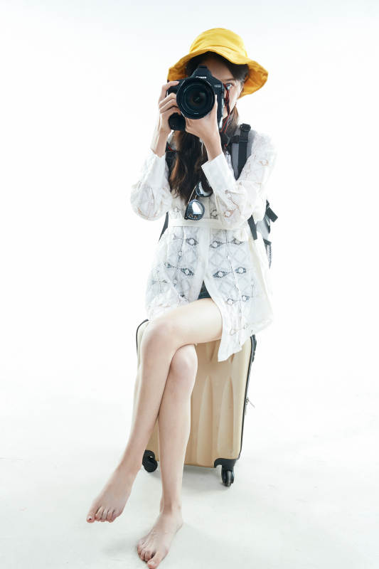 白色背景下準(zhǔn)備出發(fā)旅行的美麗東方女大學(xué)生