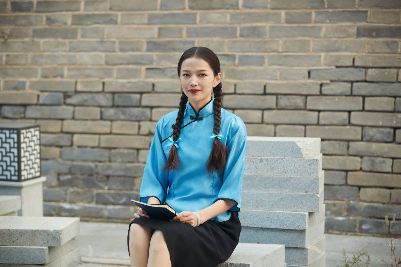 在古城身穿民國學生服飾的女大學生