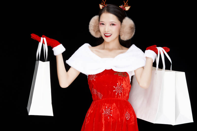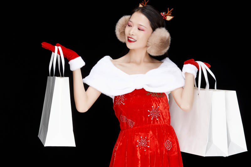 圣誕主題 紅色連衣裙 白色披肩 毛絨耳罩 鹿角發(fā)飾 紅色手套 節(jié)日裝扮 女性 灰色背景 時尚寫真