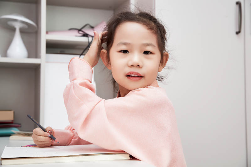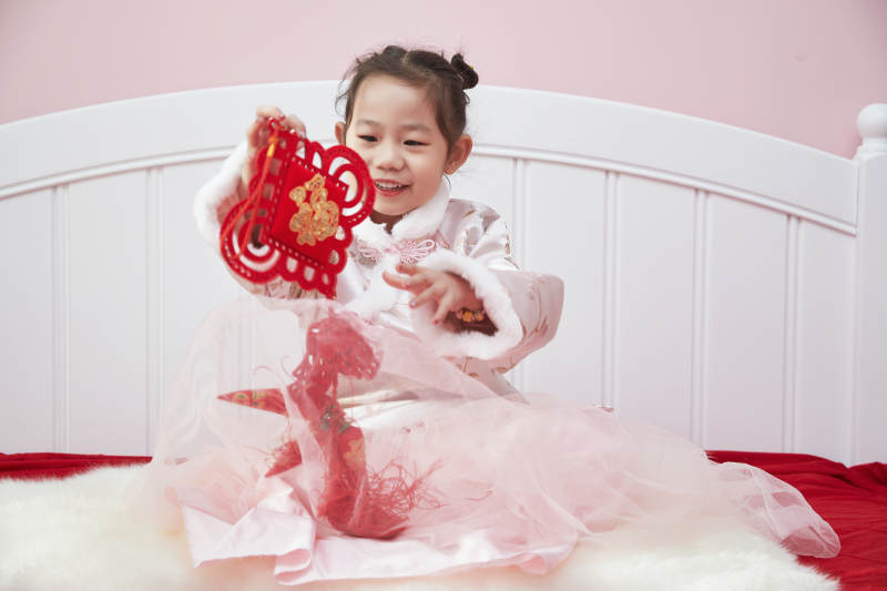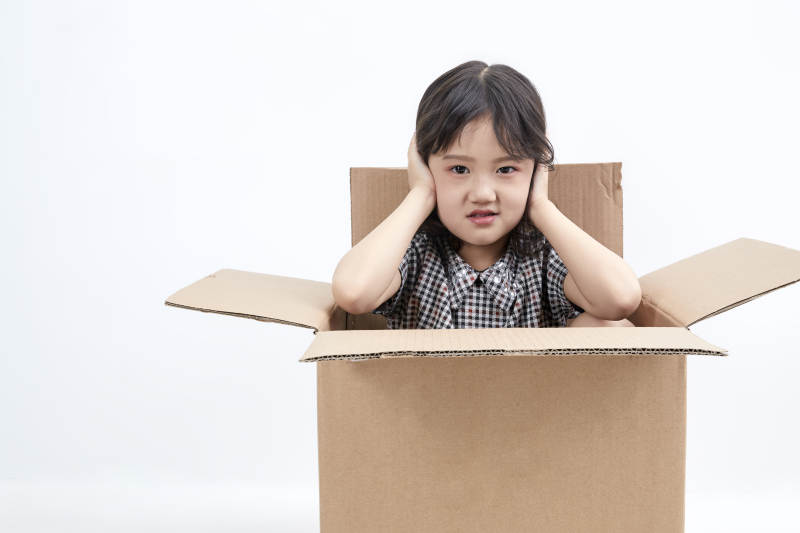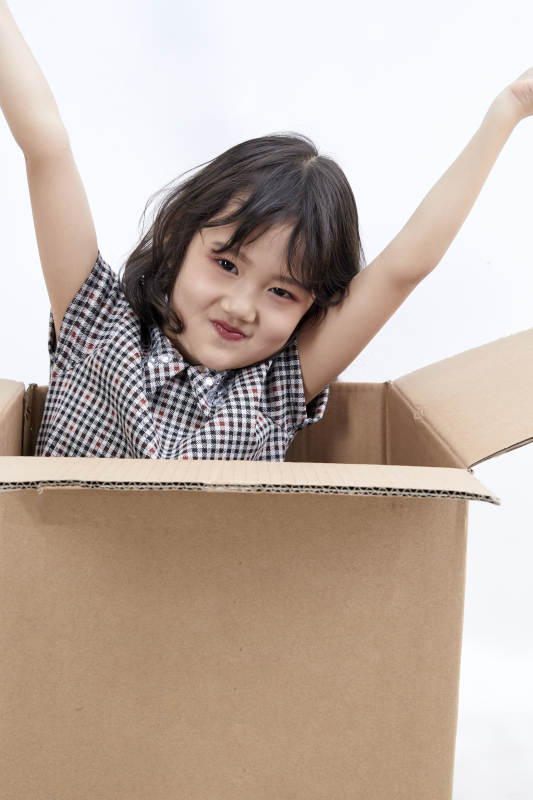 躲在紙箱中玩耍的調皮可愛亞洲小女孩兒童
