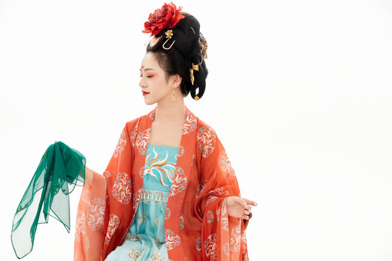 白色背景下穿著中國春秋戰國時代服飾的少女