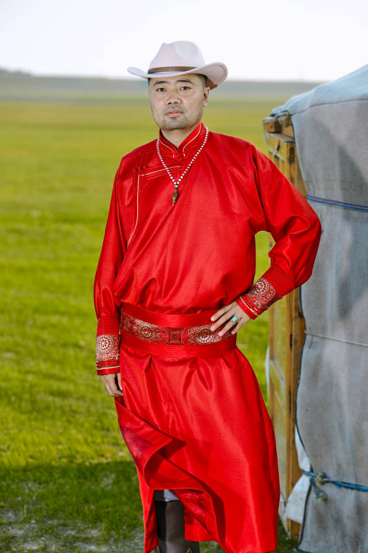 草原上蒙古包前身穿蒙古族傳統(tǒng)服飾的男子