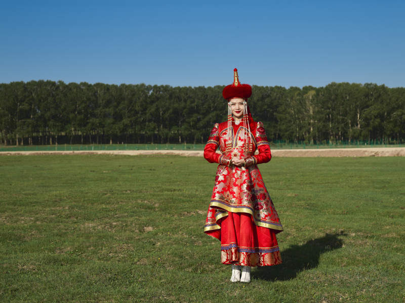 草原上穿著蒙古族傳統(tǒng)服飾的亞洲年輕美少女