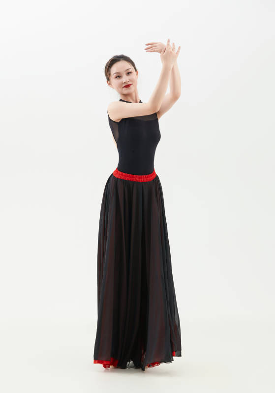 身穿紅黑相間的舞蹈長裙翩翩起舞的少女