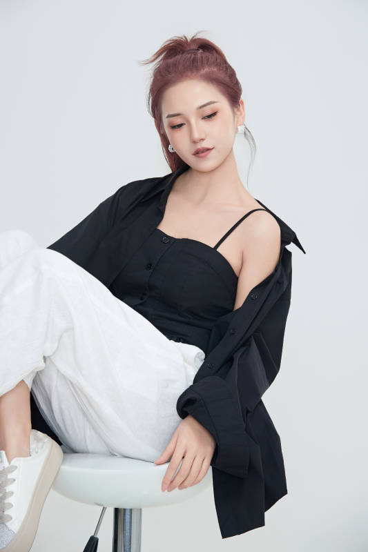 紅發(fā) 黑色襯衫 白色裙子 坐姿 時(shí)尚穿搭 簡約風(fēng)格 高跟鞋 耳環(huán) 氣質(zhì)女性 寫真照