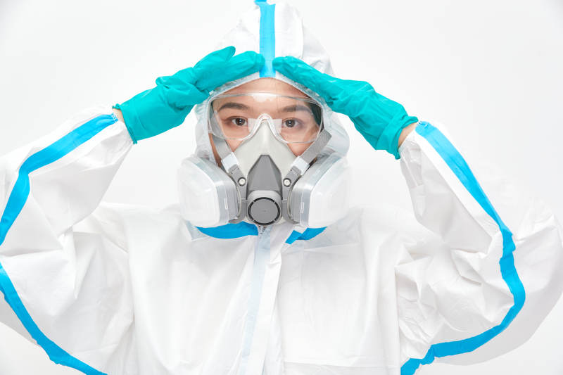 穿白色防護(hù)服佩戴護(hù)目鏡口罩的女性防護(hù)人員
