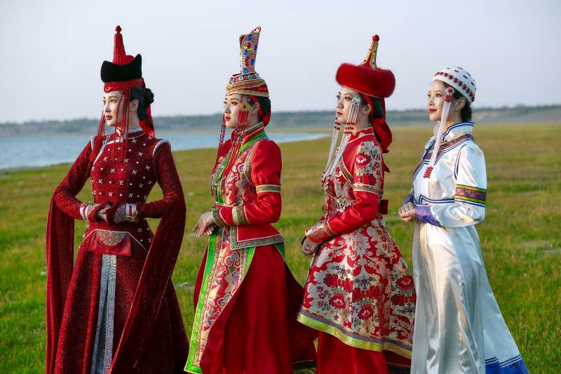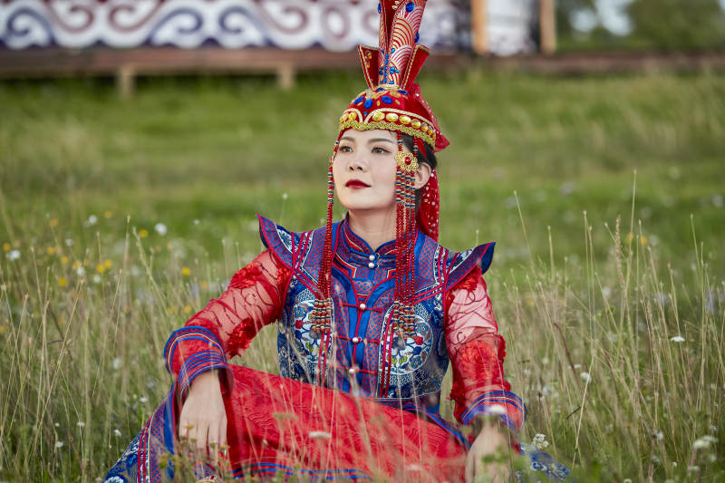草原上身穿豪華蒙古族服飾的蒙族少女