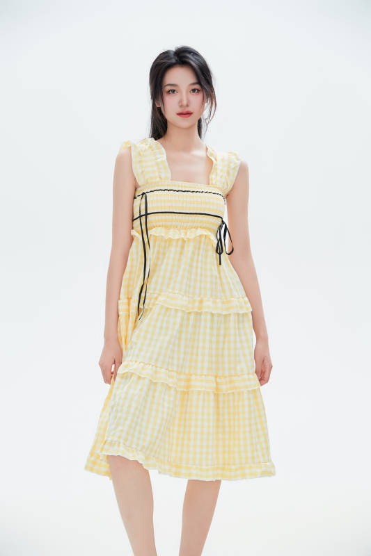 黃色格子裙 無(wú)袖連衣裙 方領(lǐng)設(shè)計(jì) 黑色系帶 層層蛋糕裙擺 清新風(fēng)格 少女感 時(shí)尚穿搭 春夏服飾 白色背景