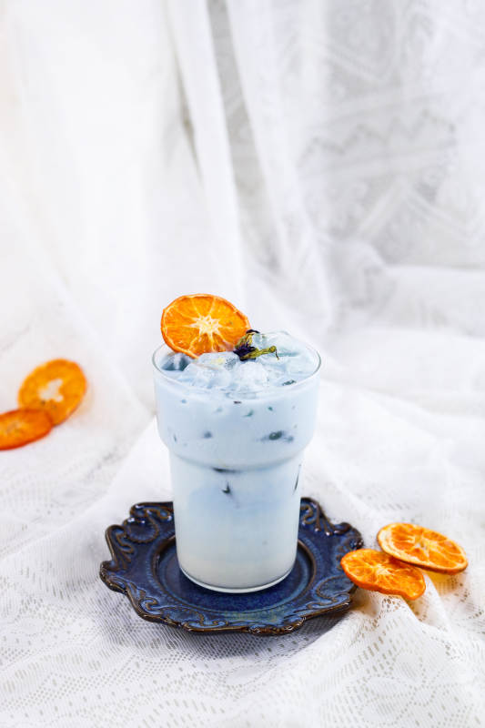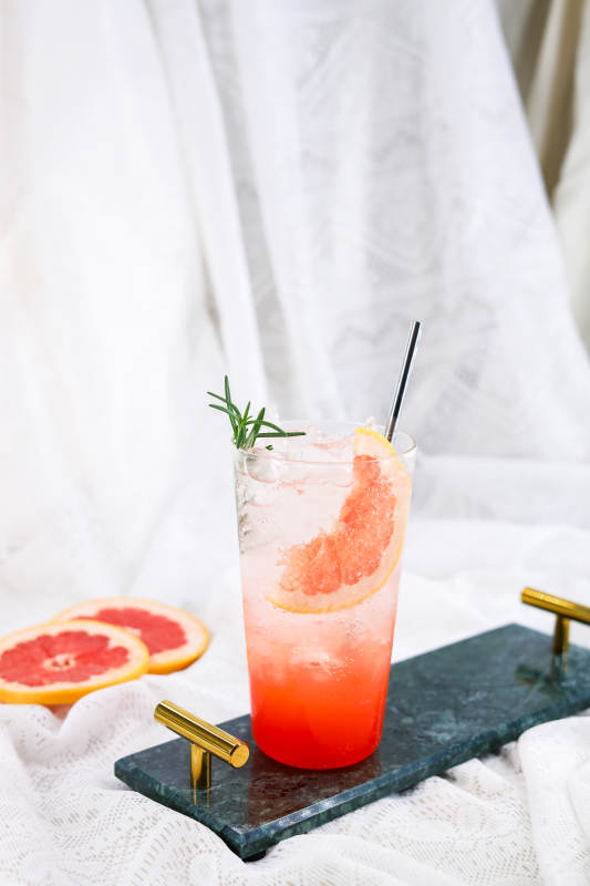 咖啡雞尾酒 冰塊 迷迭香 粉色吸管 深色杯子 咖啡豆 白色布景 金色裝飾 大理石托盤 冷飲