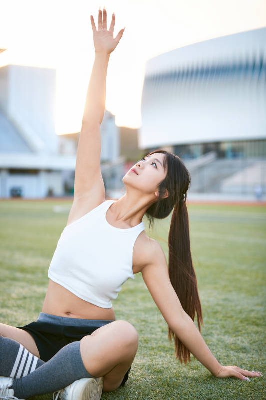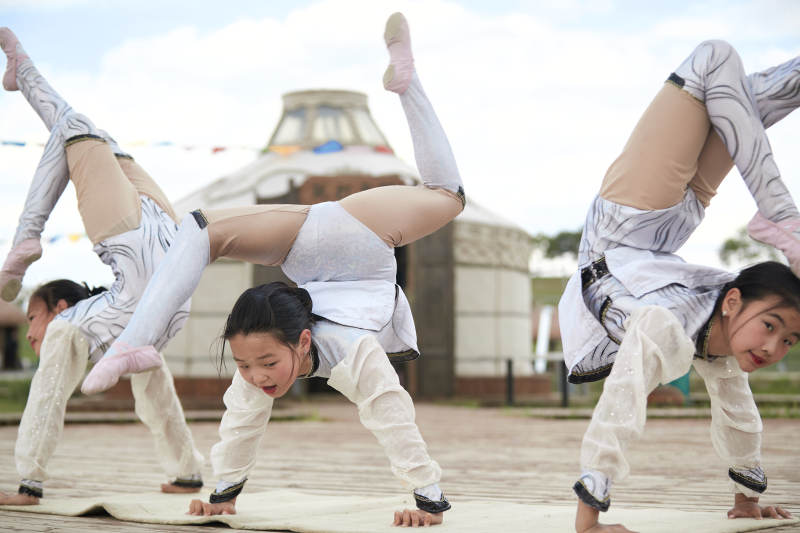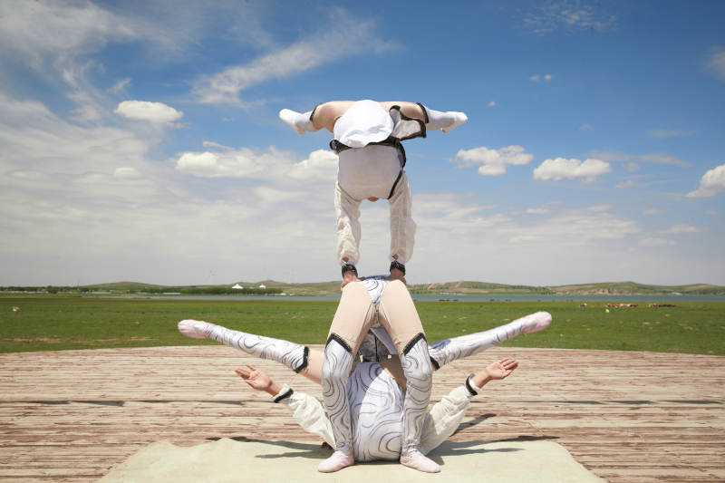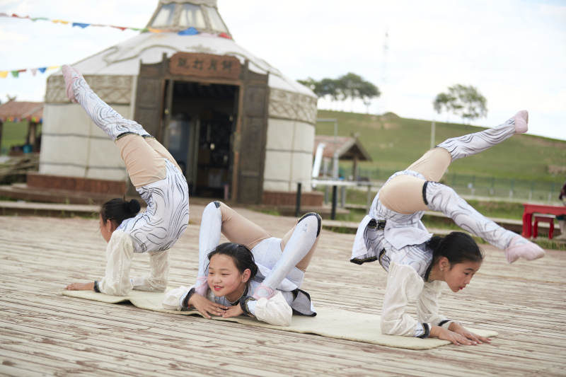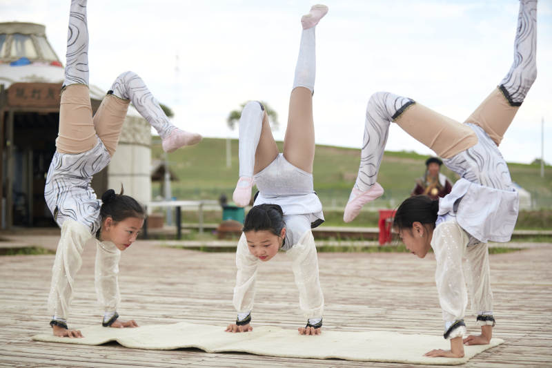 進(jìn)行柔術(shù)體操雜技表演的三個少女