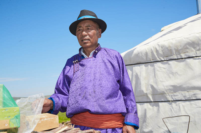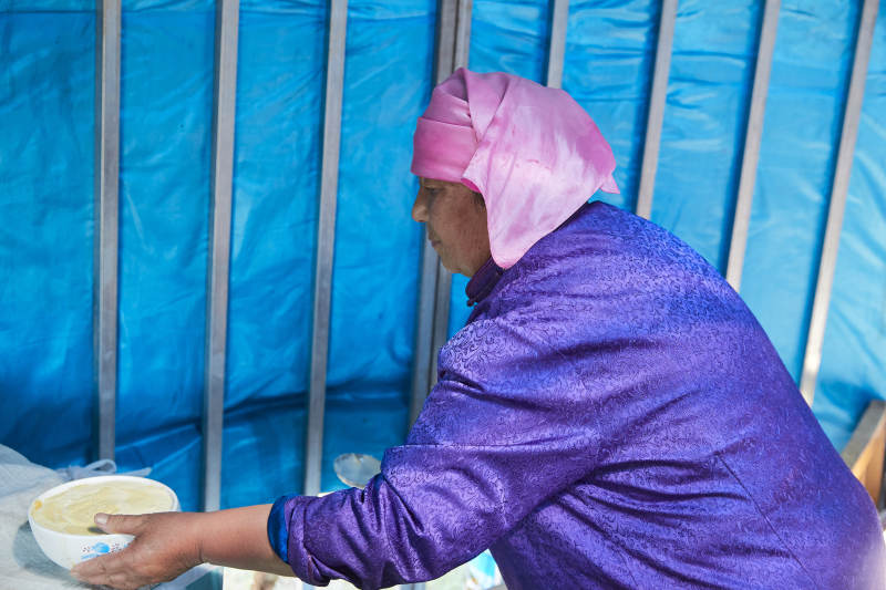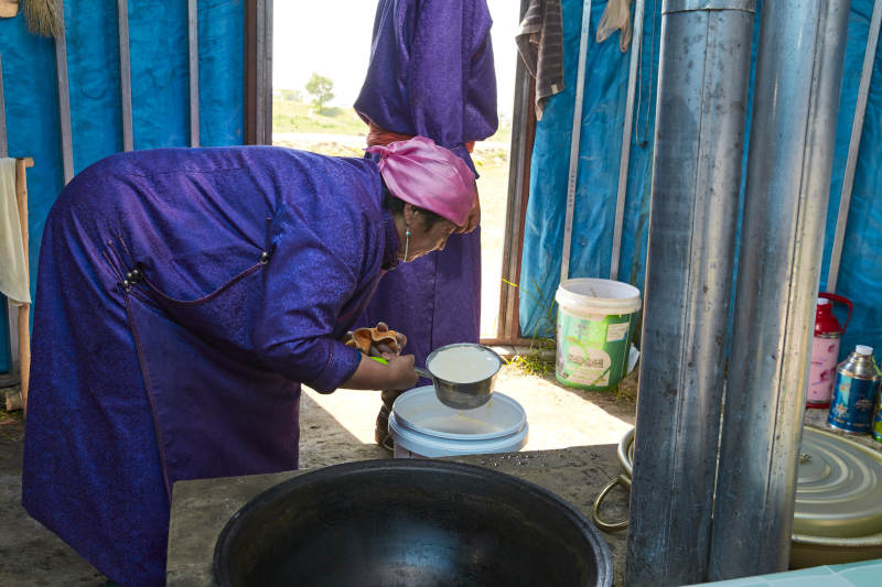 在蒙古包內(nèi)用傳統(tǒng)工藝熬煮制作奶豆腐過程