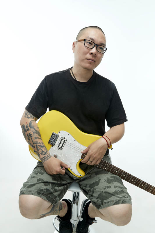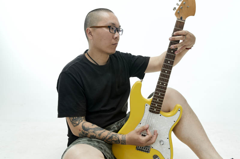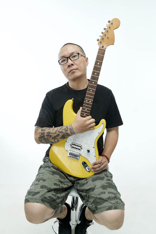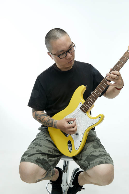 手持電吉他展示演奏的亞洲男性搖滾樂(lè)手人像