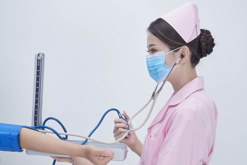 身穿粉色護士服佩戴聽診器的女性醫護人員
