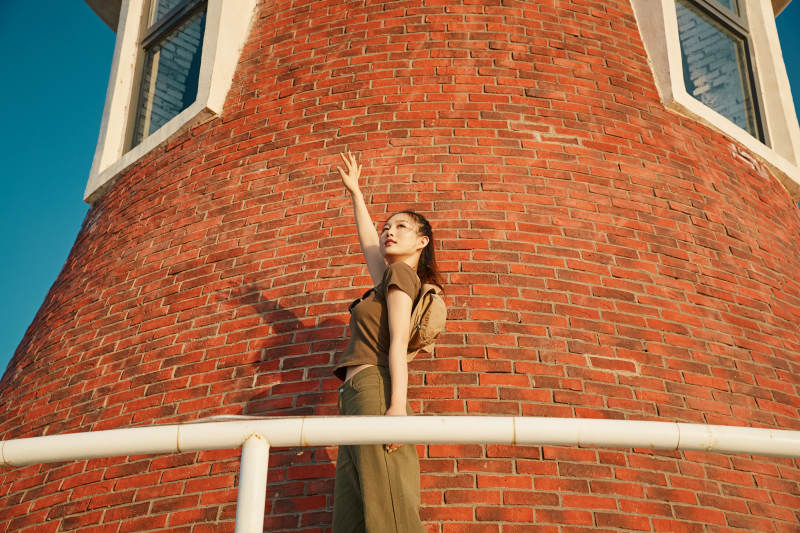 盛夏夕陽晚霞湖邊碼頭燈塔上的少女