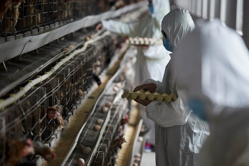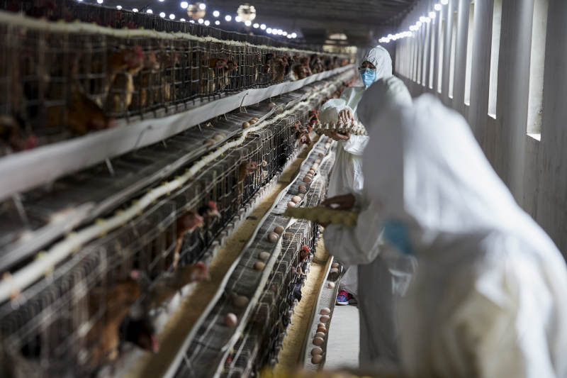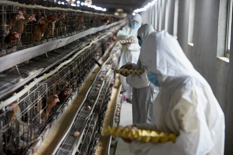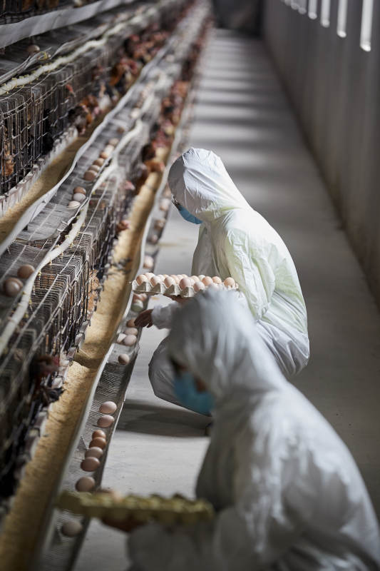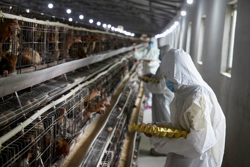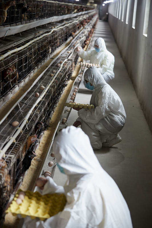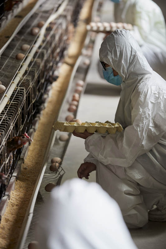 穿防護服認真收撿雞蛋的女性飼養員三人