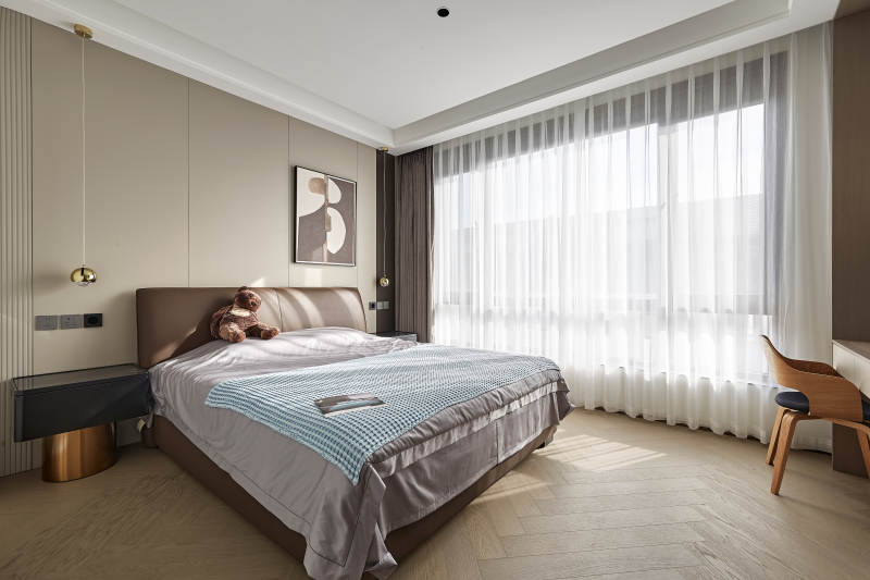 臥室 粉色墻面 云朵床頭 藍(lán)色床單 星星圖案 毛絨玩具 白色衣柜 紫色窗簾 窗戶 兒童房 現(xiàn)代風(fēng)格 溫馨裝飾