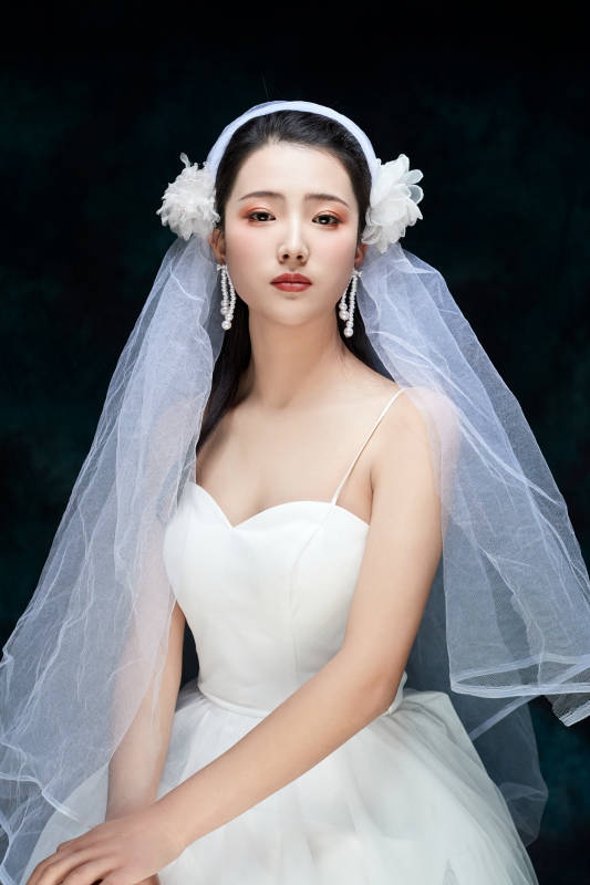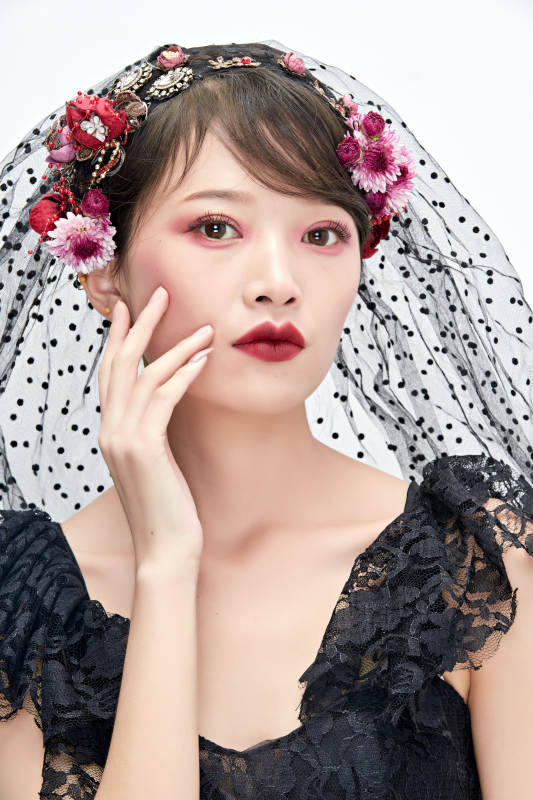 黑色蕾絲禮服 頭紗 花朵發(fā)飾 紅色唇妝 粉色腮紅 時(shí)尚造型 女性模特 優(yōu)雅姿態(tài) 白色背景 復(fù)古風(fēng)格