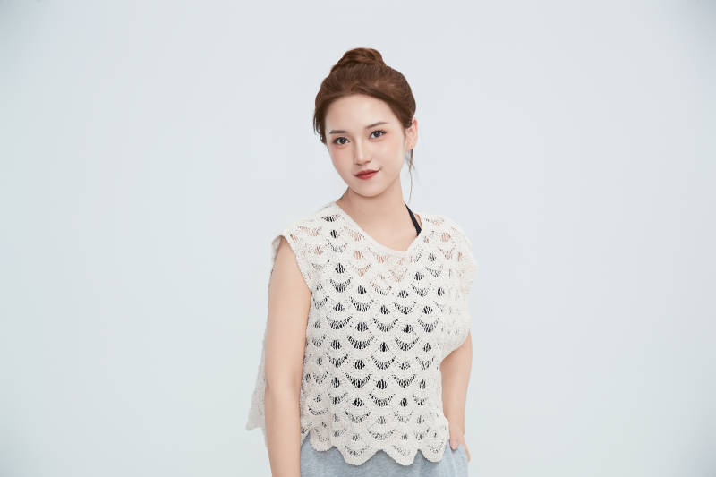 牛仔背心 白色T恤 牛仔褲 長發(fā) 馬尾辮 側(cè)身照 時尚穿搭 簡約風格 女性模特 灰色背景