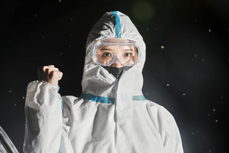 穿白色防護(hù)服佩戴護(hù)目鏡口罩的女性醫(yī)療人員