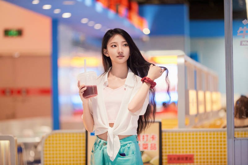 黑色上衣 藍色牛仔褲 高馬尾 時尚穿搭 簡約風(fēng)格 女性模特 寬松袖子 白色背景
