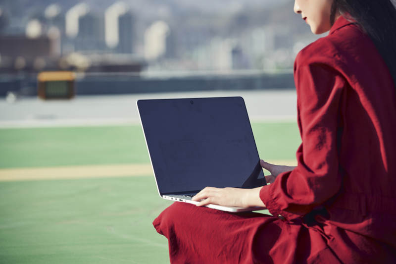 亞洲商務年輕女性在樓頂停機坪使用電腦辦公