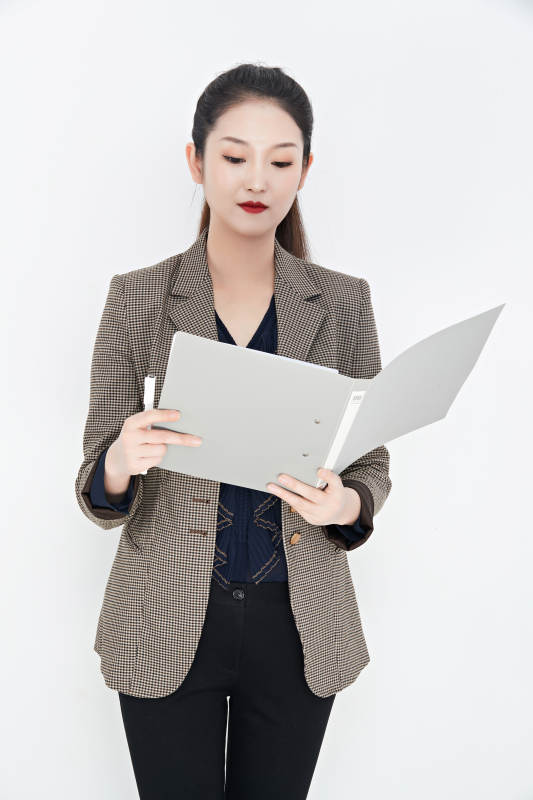 職業(yè)女性 商務(wù)裝 格子西裝 黑色褲子 白色背景 坐姿 手持文件夾 長發(fā) 紅色口紅 正式場合 辦公風(fēng)格