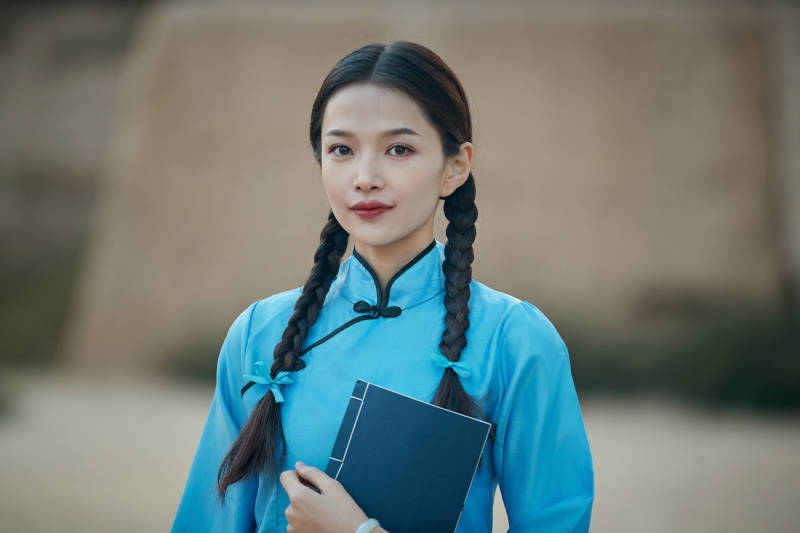 女子 藍(lán)色旗袍 雙辮子 手持書本 磚墻背景 傳統(tǒng)服飾 坐姿 古典風(fēng)格