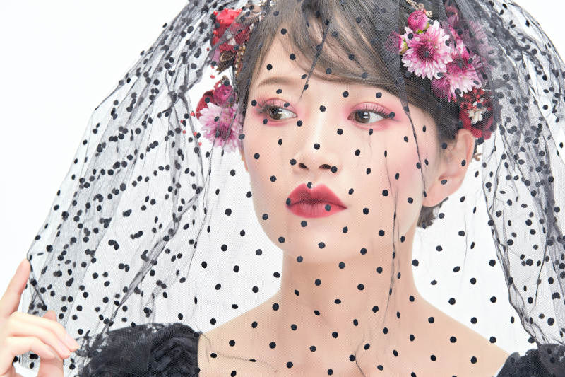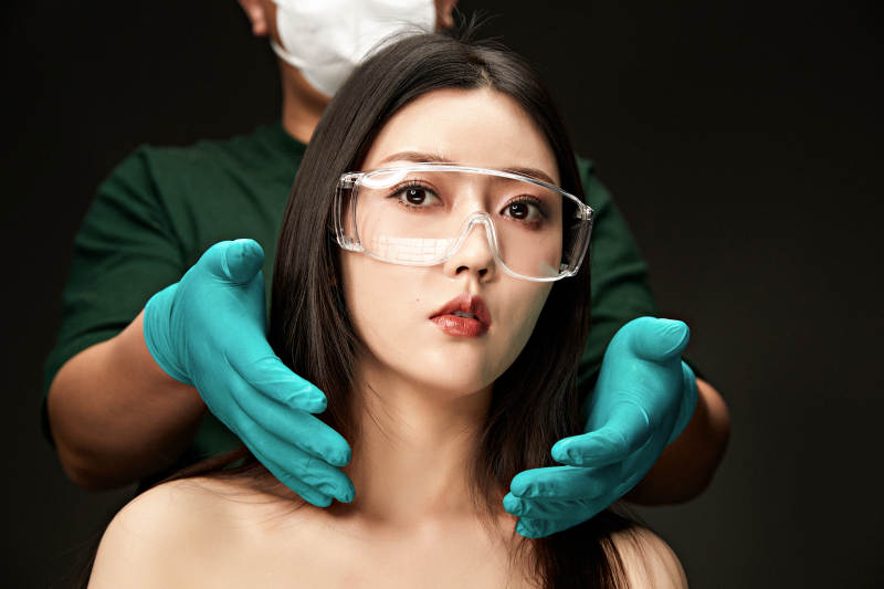 美容 化妝 造型師 白手套 女性模特 黑色背景 無(wú)肩帶連衣裙 美容工具 專(zhuān)業(yè)拍攝 時(shí)尚攝影