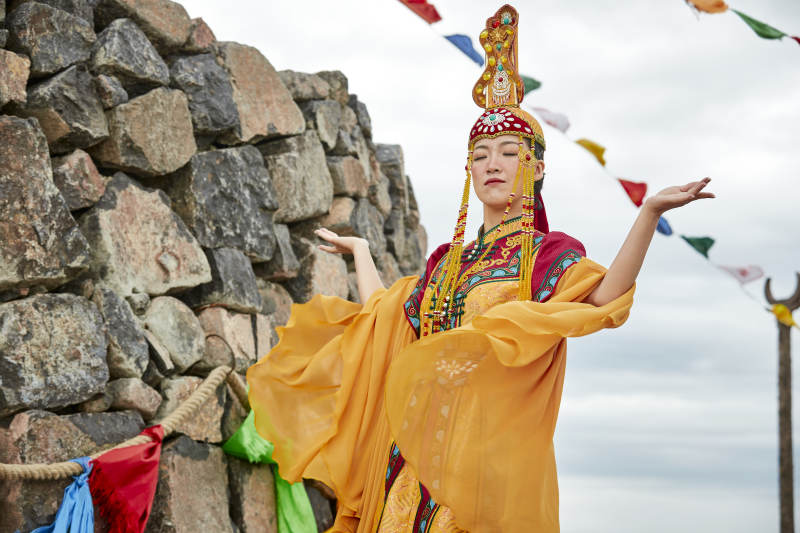 草原上敖包前身穿豪華蒙古族服飾的蒙族少女