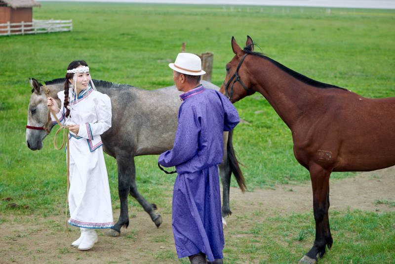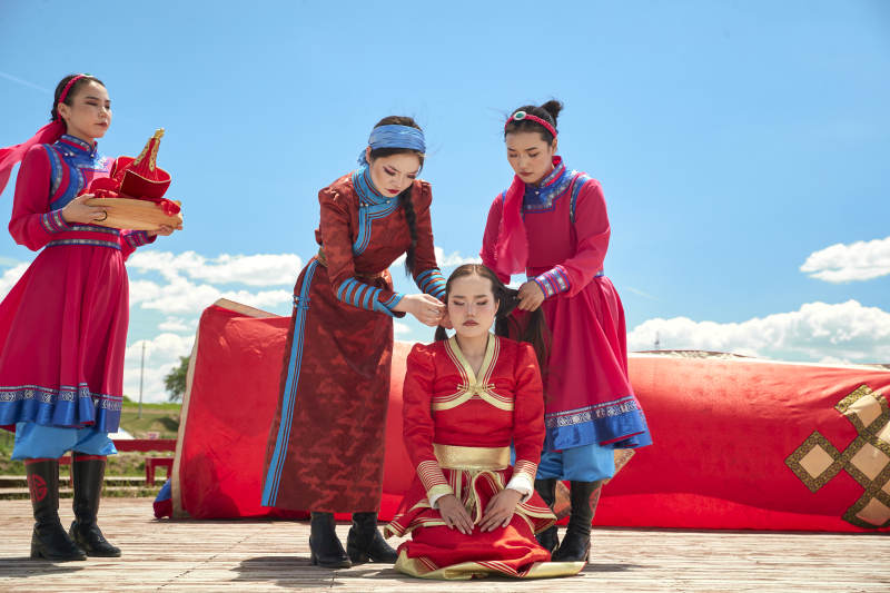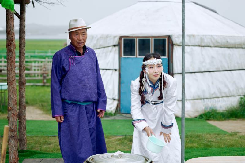 身著粵劇戲曲反串裝扮手持竹簡的青年女性