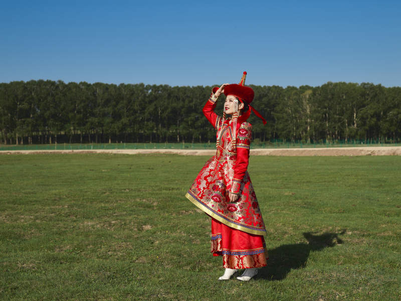 草原上穿蒙古族服飾拉馬頭琴的蒙族女樂手