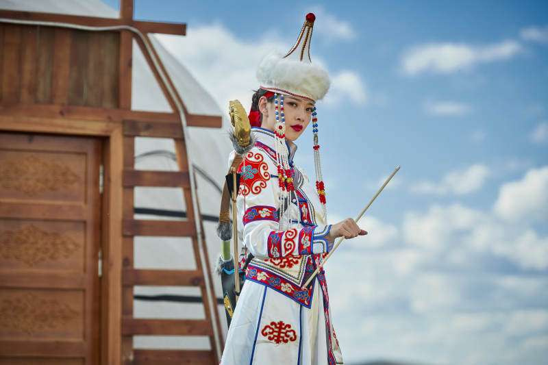 草原蒙古包前身穿豪華蒙古族服飾的蒙族少女