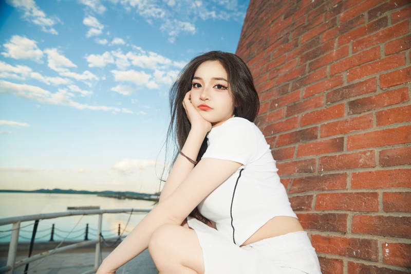 盛夏夕陽晚霞湖邊碼頭看風景的少女