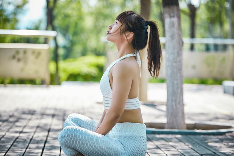 湖畔公園做瑜伽動(dòng)作的亞洲年輕女性